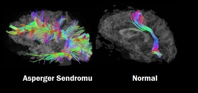 Yukarıdaki görsel; asperger sendromu bir birey ile normal bir bireyin beyinlerindeki nöronların birbirleri ile olan bağlantılarının yani konnektom haritası. Asperger sendromu bireylerin normal bireylere göre daha kompleks düşünebilmelerinin nedeni; beyinlerindeki nöronlarının diğer nöronlarla çok daha fazla bağlantı kurmasıdır. Mesela; Albert Einstein, Nicola Tesla, Edison, Bill Gates ve Elon Musk asperger sendromu olan kişilerdir.