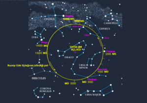 Dönme ekseninin gökküresini kuzey tarafta kestiği noktaya Kuzey Gök Uçlağı (kuzey kutup noktası ) denir ve bu noktaya çok yakın olan yıldızın (Kutup Yıldızının ) adı Polaris – Demirkazık ‘tır.